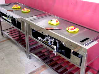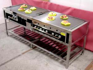 たこ焼き器 4連用・・・52,000円 (通販・たこ焼器 イー28−4orイー18−4) 遠S板焼器(R-1-a)・・・\64,000 ステンガス台・・・・・・・¥37.000 W1500xD450xH650(高さ) 耐荷重仕上でオールステンのオリジナル品 ステンガス台←各種サイズを見る *このセットがあればすぐに、たこ焼と鉄板焼屋さんができます *その他組み合わせは色々とできます。お問合せください。 |
