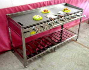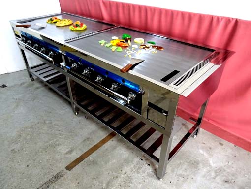 | *ステーキハウスの方にお薦め! 2.) R-12-L-6 1200x550型 W1380xD610X高さ(750〜850) *高さはご指定下さい 鉄板:1200x550x19mm 研磨仕上げ 丸バーナーx2付き 購入する 参考価格:¥468,000−送料は別途 |